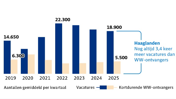 De spanning op de arbeidsmarkt blijkt onder meer uit de verhoudingen tussen openstaande functies en beschikbare werkzoekenden. In een recente periode stonden er in Haaglanden gemiddeld 18.900 vacatures open, tegenover circa 5.500 werkzoekenden met een kortdurende WW-uitkering. Dat betekent dat er voor elke werkzoekende ruim drie vacatures zijn. De vraag is vooral groot in beroepen op niveau 3 en 4, terwijl veel werkzoekenden ervaring hebben op lagere beroepsniveaus.